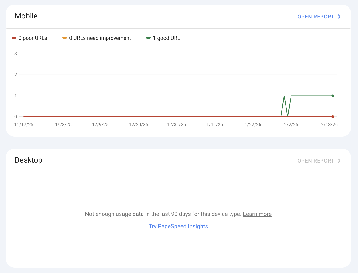 Die Core Web Vitals messen die Seitengeschwindigkeit und Nutzererfahrung. Eine lange Ladezeit erhöht die Absprungrate und kann das Ranking beeinträchtigen. Google nutzt diese Kennzahlen als Rankingfaktor. Die Search Console zeigt an, wie viele Ihrer URLs als gut, verbesserungswürdig oder schlecht eingestuft werden. So sehen Sie, wo Optimierungsbedarf besteht.