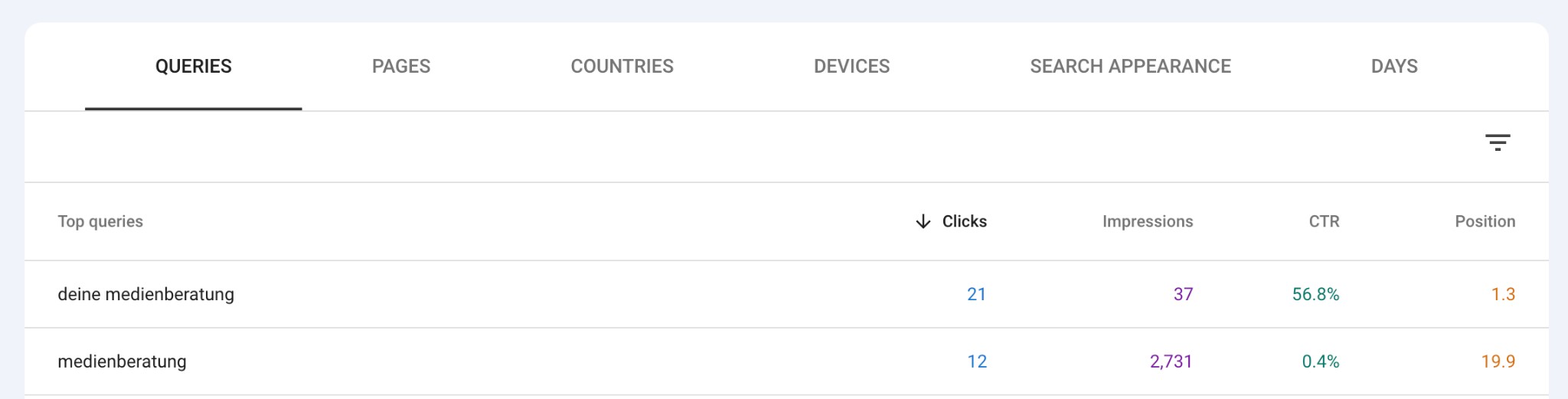 Unter dem Menüpunkt Leistung sehen Sie, wie Ihre Seite in Google performt. Die Summe der Klicks, Impressionen, die durchschnittliche Position und die Klickrate (CTR) geben einen guten Überblick. Außerdem erfahren Sie, durch welche Suchanfragen Nutzer auf Ihre Seite gelangt sind. Diese Daten sind wertvoll für die Keyword Optimierung und die Abstimmung Ihrer Inhalte.