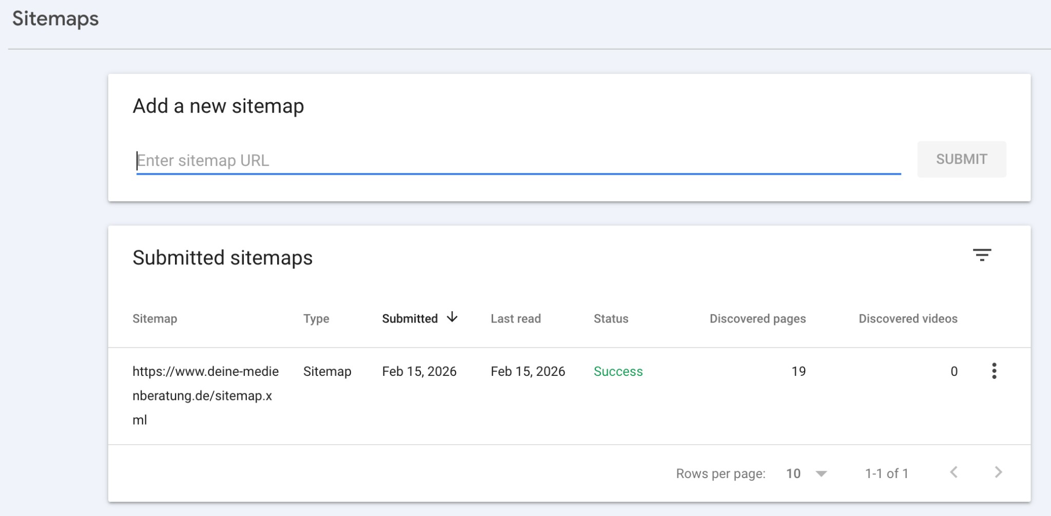 Eine Sitemap listet die wichtigsten Seiten Ihrer Website auf und hilft Google beim Crawlen. In der Search Console können Sie Sitemaps einreichen, verwalten und prüfen. Die Datei zeigt Google welche URLs existieren und wie die Struktur Ihrer Site aufgebaut ist. Eine funktionierende Sitemap unterstützt die Indexierung und gehört zur Basis einer guten technischen SEO.